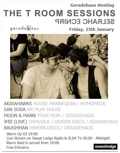 Get a pre-taste at Prince Charles this coming Friday 26th with free entry from 7 till 11.30pm at the T Room Session live streaming presented by Sweat Lodge special Geradehaus with Akirahawks, San Soda, Moon&Mann, JMII and Baughman.
